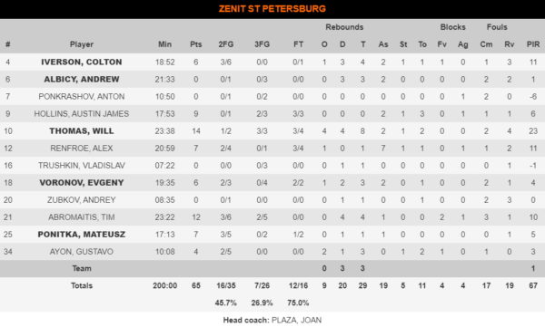 Από την άλλη, για την Ζενίτ διακρίθηκαν οι Τόμας (14 πόντοι, 8 ριμπάουντ), Αμπρομάιτις (12 πόντοι), με τον Πλάθα να χάνει τον Αγιόν από το δεύτερο δεκάλεπτο, αφού ο Μεξικανός σέντερ έσπασε τη μύτη του.