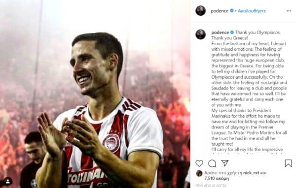 Ένα ξεχωριστό ευχαριστώ στον πρόεδρο Μαρινάκη για την προσπάθεια που έκανε να με αποκτήσει και που με άφησε να ακολουθήσω το όνειρό μου να παίξω στην Premier League. Στον Πέδρο Μαρτίνς για όλη την εμπιστοσύνη που μου έδειξε και όσα μου έμαθε.