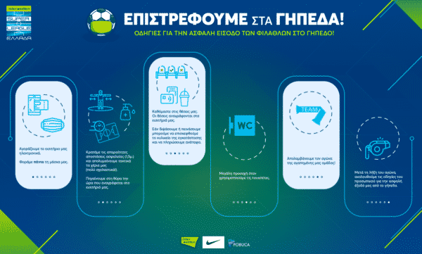 – Οι γηπεδούχες Π.Α.Ε., μέσω της επίσημης ιστοσελίδας τους και των μέσων κοινωνικής δικτύωσης θα ενημερώνουν για τα μέτρα προστασίας έναντι στον κορονοϊό SARS-CoV-2, το πρωτόκολλο για τηνεπιστροφή των φιλάθλων στα γήπεδα και γενικάοποιαδήποτε πληροφορία σχετικά με την παρουσίαφιλάθλων στα γήπεδα