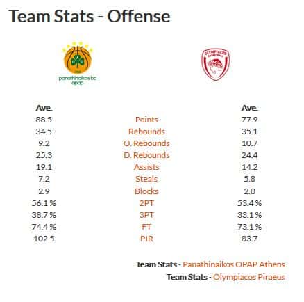 Οι Ερυθρόλευκοι πετυχαίνουν λοιπόν 77,9 πόντους ανά παιχνίδι, αν και το τελευταίο διάστημα ο αριθμός όλο και μεγαλώνει. Είναι ομάδα που παίρνει επιθετικά ριμπάουντ μέσω του Μιλουτίνοφ (10,7 ομαδικά ανά ματς). Ο Ολυμπιακός σε αυτές τις 11 αγωνιστικές έχει 53,4% στο δίποντο, 33,1% στο τρίποντο και 73,1% στις βολές. Βέβαια είναι κυριαρχικός στους αιθέρες, φτάνοντας στα 35,1 ριμπάουντ ανά ματς.