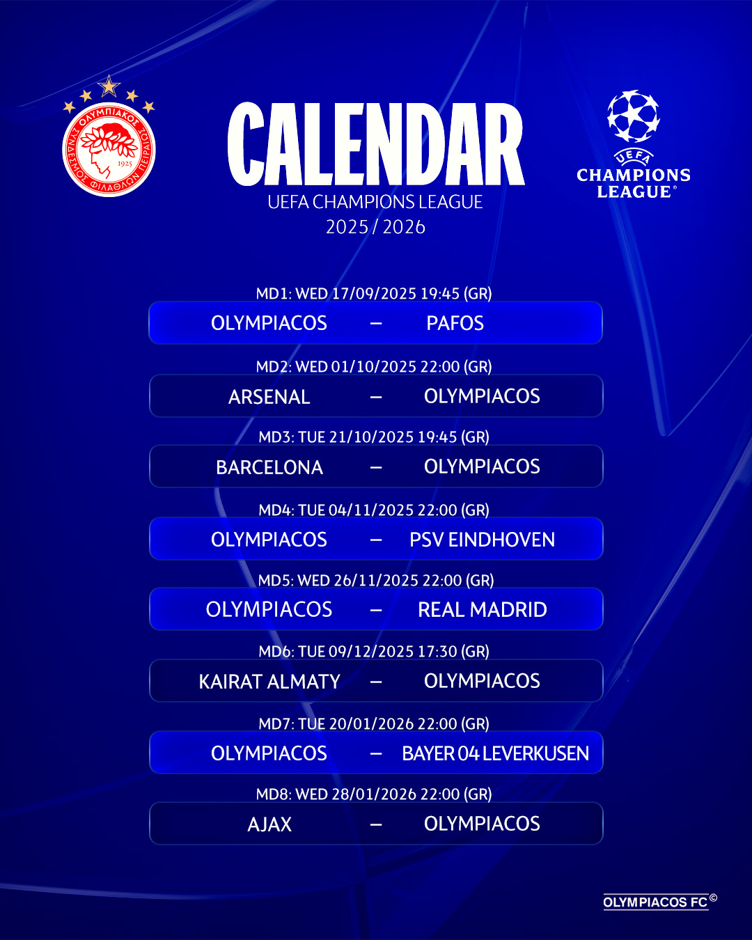 Ο Ολυμπιακός ξεκινά στο «Γ. Καραϊσκάκης» απέναντι στην Πάφο στις 17/9. Ακολουθούν δύο εκτός έδρας, απέναντι σε Άρσεναλ και Μπαρτσελόνα. Στη συνέχεια δύο εντός έδρας απέναντι σε Αϊντχόφεν και Ρεάλ Μαδρίτης. Το 2025 κλείνει με την εκτός έδρας αναμέτρηση με την Καϊράτ Αλμάτι στο Αζερμπαϊτζάν. Οι δύο τελευταίες αγωνιστικές, που θα είναι τον Ιανουάριο του 2026 θα είναι εντός έδρας με τη Λεβερκούζεν και το πρόγραμμα κλείνει στο Άμστερνταμ απέναντι στον Άγιαξ.