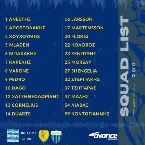 Από την αποστολή θα απουσιάζει μόνο ο Χόρχε Ντίαζ με όλους τους υπόλοιπους ποδοσφαιριστές να είναι διαθέσιμοι.