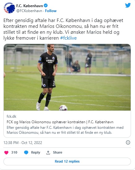 Η Κοπεγχάγη ανακοίνωσε στο Twitter πως ο Μάριος Οικονόμου θα αποτελέσει παρελθόν. Το συμβόλαιο του Έλληνα λύθηκε κοινή συναινέσει.