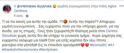«Τι να πει κανείς για αυτήν την ομάδα..?? Αυτήν την παρέα?? Αποχωρώ γεμάτη ευγνωμοσύνη… Σας ευχαριστώ πολύ για την υπέροχη χρονιά, για την άνοδο, για τις στιγμές.. Όλες ήταν ξεχωριστές!!! Ιδιαίτερη μνεία στον Δημήτρη Σκούλικα χωρίς αυτόν δεν θα υπήρχε το γυναικείο τμήμα.. Κυριε Δημήτρη σας ευχαριστώ ολόψυχα για όλα!!! Όσο για εσάς κορίτσια δεν λέω τίποτα… ραντεβού στα γήπεδα!! Εις το επανιδείν κρονάρα!!!»