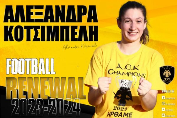 Η ΑΕΚ βρίσκεται στην ευχάριστη θέση να ανακοινώσει την ανανέωση της συνεργασίας με την Αλεξάνδρα Κοτσιμπέλη. Η 19χρονη (04/08/2003) τερματοφύλακας θα παραμείνει και την επόμενη σεζόν στο δυναμικό της Γυναικείας Ομάδας Ποδοσφαίρου του Συλλόγου.