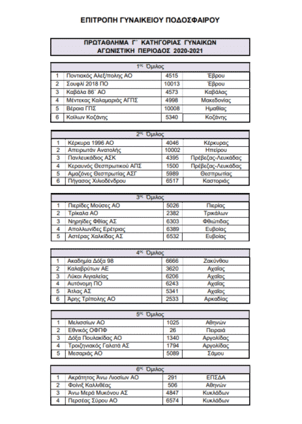 α) Η Επιτροπή Γυναικείου Ποδοσφαίρου αφού έλαβε υπόψη τα αιτήματα των ομάδων Κοίλων Κοζάνης και Πήγασος Χιλιοδένδρου, για αμοιβαία αντικατάσταση τους στον 1ο και 2ο Όμιλο της Γ΄ Κατηγορίας τα έκανε δεκτά. Έγκριση της ανωτέρω μεταβολής από ΕΕ/ΕΠΟ απόφαση Νο 44/08-10-2020.
