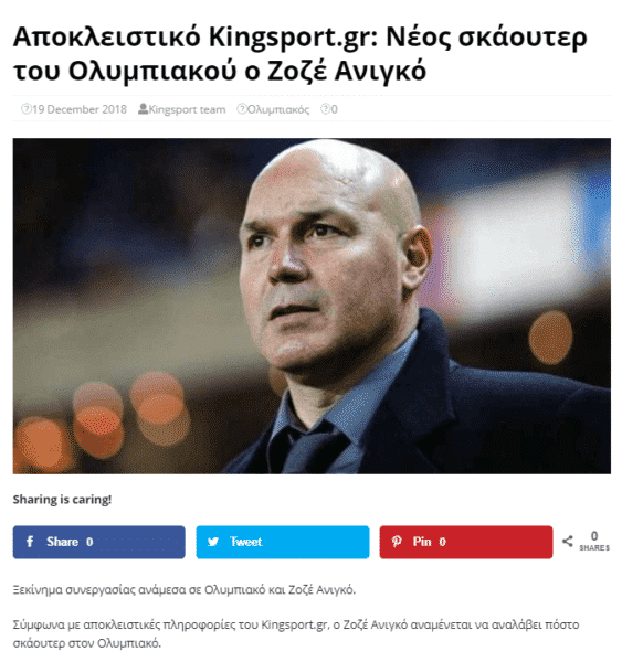 «Νέος υπεύθυνος μεταγραφών στον Ολυμπιακό για τους επόμενους έξι μήνες αναλαμβάνει ο Ζοσέ Ανιγκό».