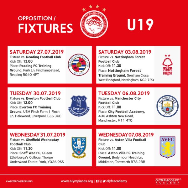 Οι ποδοσφαιριστές του κ. Ρικάρντο Πέρες, θα ζήσουν μία ξεχωριστή εμπειρία και θα δώσουν συνολικά 6 δυνατά και πολύ σπουδαία φιλικά παιχνίδια με τις: Νότιγχαμ Φόρεστ, Μάντσεστερ Σίτι, Έβερτον, Άστον Βίλα, Ρέντινγκ και Σέφιλντ Γουένσντεϊ. Όλα τα παιχνίδια πλην αυτού με την Φόρεστ θα γίνουν στο προπονητικό κέντρο των αντιπάλων ομάδων βοηθώντας έτσι στην ακόμα μεγαλύτερη συλλογή εμπειριών για τους νέους ποδοσφαιριστές του ΟΛΥΜΠΙΑΚΟΥ.