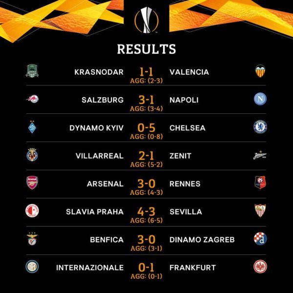Την πρόκριση στους «8» εξασφάλισε η Άρσεναλ απέναντι στη Ρεν, ενώ και η Άιντραχτ κέρδισε με 1-0 την Ίντερ. Η Σλάβια Πράγας έκανε την ανατροπή στην παράταση και πήρε τη νίκη κόντρα στη Σεβίλλη, στο πλαίσιο της δεύτερης φάσης των «16» Europa League.