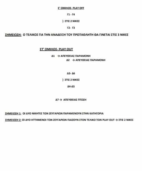 Θα θέλαμε να επισημάνουμε ότι, στην αναφορά μας στη δημιουργία των Γ’ και Δ’ ομίλων, ο Α4 και ο Β4 που θα αγωνίζονται μεταξύ τους για να προκύψει ο νικητής της σειράς(θα μπει στο Γ’ Όμιλο των play off) και ο ηττημένος(θα μπει στο Δ’ Όμιλο των play out) τα παιχνίδια θα είναι διπλά. Δηλαδή ένα παιχνίδι στην έδρα του ενός και ένα παιχνίδι στην έδρα του άλλου όπου ο νικητής θα προκύψει από τη διαφορά των μεταξύ τους πόντων.
