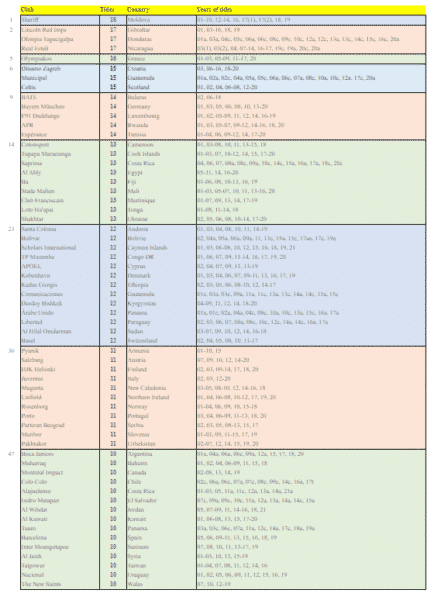 Ενώ σε απόλυτους αριθμούς, στην πρώτη θέση είναι η Σερίφ Τιρασπόλ της Μολδαβίας με 18 τίτλους στους 20 διεκδικήσιμους.