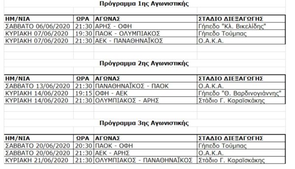 Η αρχή θα γίνει το Σάββατο 6/6 στις 19:30 με το Άρης-ΟΦΗ, ενώ την Κυριακή στις 19:30 θα γίνει το ΠΑΟΚ-Ολυμπιακός και στις 21:45 το ΑΕΚ-Παναθηναϊκός.