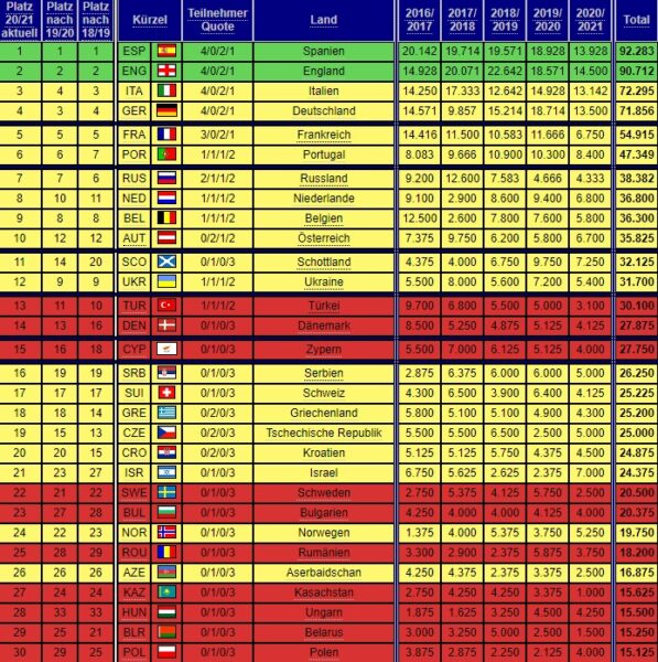 *με πράσινο χρώμα οι χώρες που συνεχίζουν με όλες τις ομάδες στις ευρωπαϊκές διοργανώσεις, με κίτρινο οι χώρες που έχουν “χάσει” ομάδες και με κόκκινο οι χώρες που δεν έχουν πλέον εκπρόσωπο.