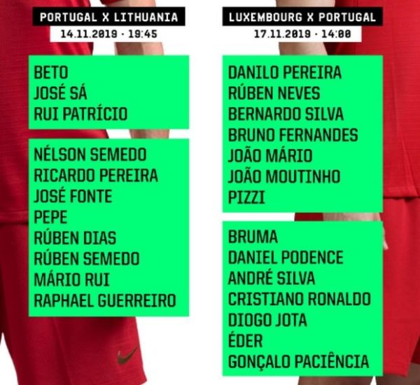 Ανακοινώθηκε η αποστολή της Εθνικής ομάδας της Πορτογαλίας εν όψει των αναμετρήσεων με Λιθουανία και Λουξεμβούργο στις 14 και 17 Νοεμβρίου αντίστοιχα, για τα προκριματικά του Euro 2020.