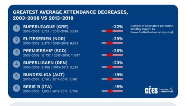 Όπως επισημαίνεται στην έρευνα, η Ελλάδα την πενταετία 2003-2008 είχε μέσο όρο 5.724 εισιτήρια, ενώ την πενταετία 2013-2018 μ.ο. 3.896. Που σημαίνει ότι η μείωση ήταν της τάξης του -32%. Ποσοστό που φέρνει την χώρα μας στην πρώτη θέση με τη μεγαλύτερη πτώση στον μέσο όρο θεατών στα γήπεδα ανάμεσα σε 51 πρωταθλήματα σε 42 χώρες.