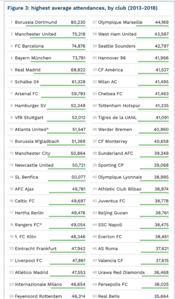 Σε ότι αφορά τον μέσο όρο θεατών σε απόλυτους αριθμούς σε συλλογικό επίπεδο, την πρωτιά απολαμβάνει η Μπορούσια Ντόρτμουντ με μ.ο. 80.230. Βέβαια, σημαντικό ρόλο παίζει και η χωρητικότητα των γηπέδων. Το καλύτερο στοιχείο θα ήταν το ποσοστό πληρότητας των σταδίων. Το αξιοσημείωτο πάντως είναι ότι στην πρώτη δεκάδα βρίσκονται πέντε γερμανικές ομάδες.