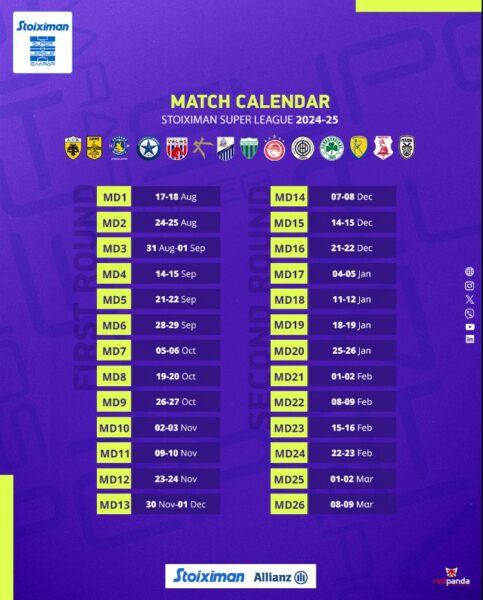 🗓️ @Stoiximan Super League 2024-25 regular season match calendar#slgr #StoiximanSuperLeague #Season2024_25 #match #Calendar #Stoiximan #Football pic.twitter.com/XYY562Gvzu