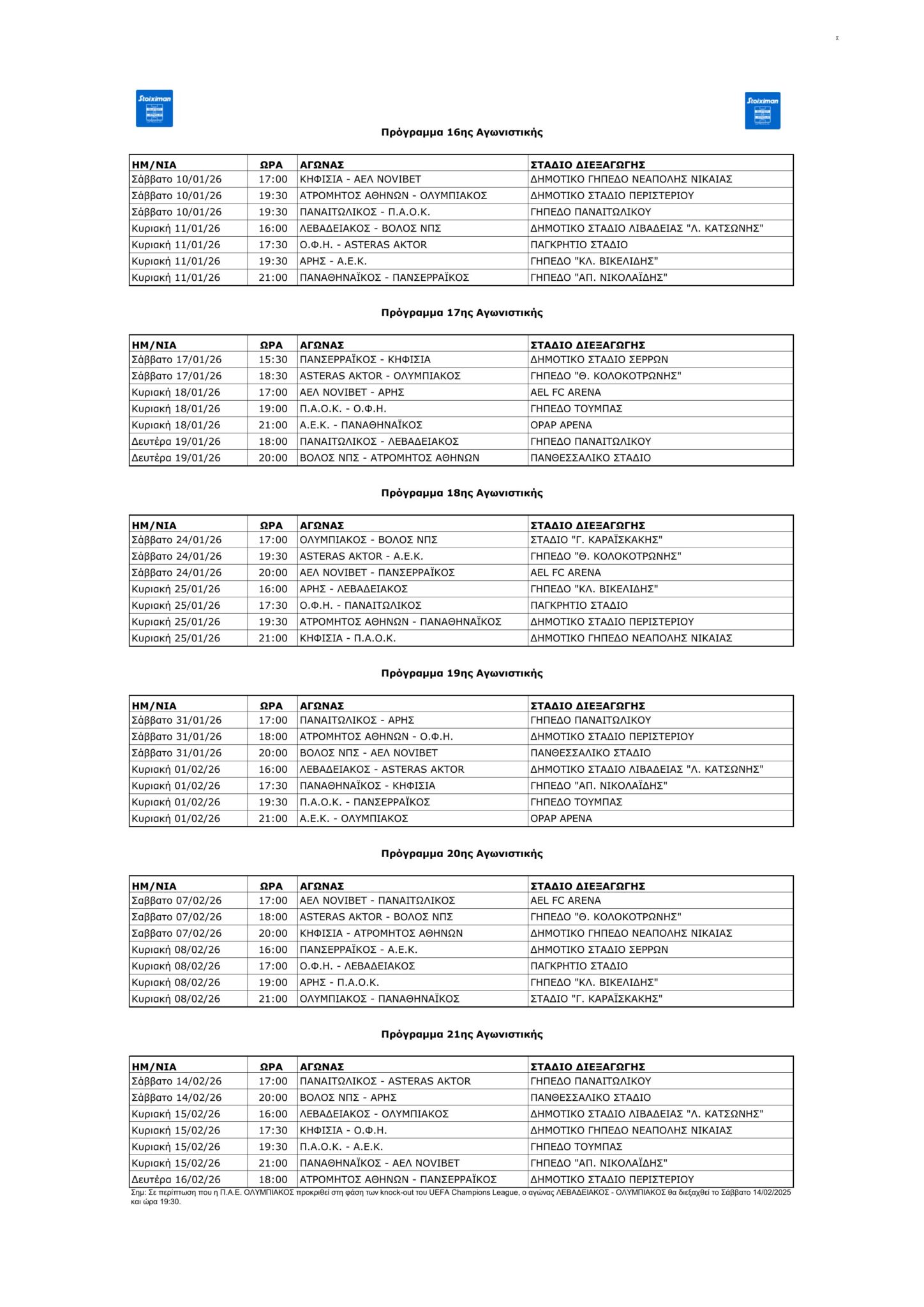 Το πρόγραμμα του πρωταθλήματος από τη 16η έως την 26η αγωνιστική.