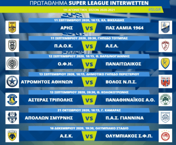 Σημειώνεται πως το ντέρμπι “ΑΕΚ – Ολυμπιακός” και το ματς “Απόλλων Σμύρνης – ΠΑΣ Γιάννινα” έχουν αναβληθεί. Το πρώτο θα διεξαχθεί στις 16 Δεκεμβρίου και το δεύτερο στις 21 Οκτωβρίου.