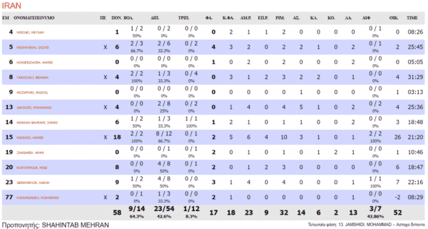 Για την ομάδα του Σκουρτόπουλου ξεχώρισε ο Αντετοκούνμπο με 19 πόντους, 13 ριμπάουντ και 4 ασίστ. Σημαντική ήταν η συνεισφορά του Παναγιώτη Βασιλόπουλου, ο οποίος ήταν εύστοχος έξω από τη γραμμή του τριπόντου, έχοντας 2/2 τρίποντα. Τέλος σημαντική ήταν η παρουσία του Ντίνου Μήτογλου και του Κώστα Παπανικολάου, οι οποίοι τελείωσαν το ματς με 10 πόντους. Από την άλλη μεριά ο σημαντικότερος παίκτης του Ιράν ήταν ο Χαντάντι, οποίος έφτασε στο double-double με 18 πόντους και 10 ριμπάουντ.
