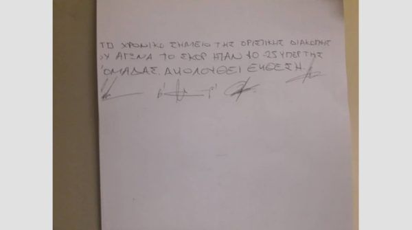 ο αγώνας διεκόπη οριστικά σε βάρος της β’ ομάδας, η οποία δεν εμφανίστηκε στον αγωνιστικό χώρο για την έναρξη δευτέρου ημιχρόνου. Δόθηκε προθεσμία 15 λεπτών και μετά το πέρας της έκλεισε το φύλλο». Παράλληλα, κάνει αναφορά σε 10 πυρσούς που άναψαν στο ξεκίνημα και στη συνέχεια τονίζεται ότι αναμένεται η έκθεση των διαιτητών στον αθλητικό δικαστή.