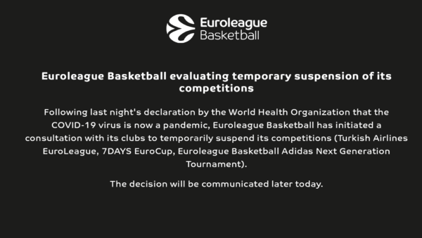 Μετά την χθεσινή ανακοίνωση του Παγκοσμίου Συμβουλίου Υγείας ότι χαρακτηρίζει τον κορονοϊό ως πανδημία, η EuroLeague Basketball ξεκίνησε επαφές με τους συλλόγους προκειμένου να υπάρξει προσωρινή διακοπή των διοργανώσεων (EuroLeague, EuroCUp και Adidas Next Generation Tournament).
