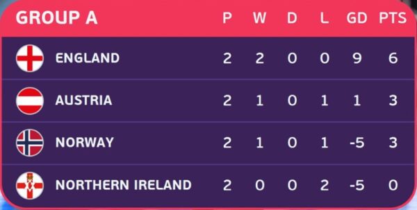 Έτσι, η Αγγλία φτάνει τους 6 βαθμούς “κλειδώνοντας” μαθηματικά την πρόκριση, Αυστρία και Νορβηγία έχουν από 3 (παίζουν την 3η αγωνιστική και εκεί θα κριθεί η πρόκριση), ενώ Βόρεια Ιρλανδία μένει στους 0, και έμεινε εκτός συνέχειας.