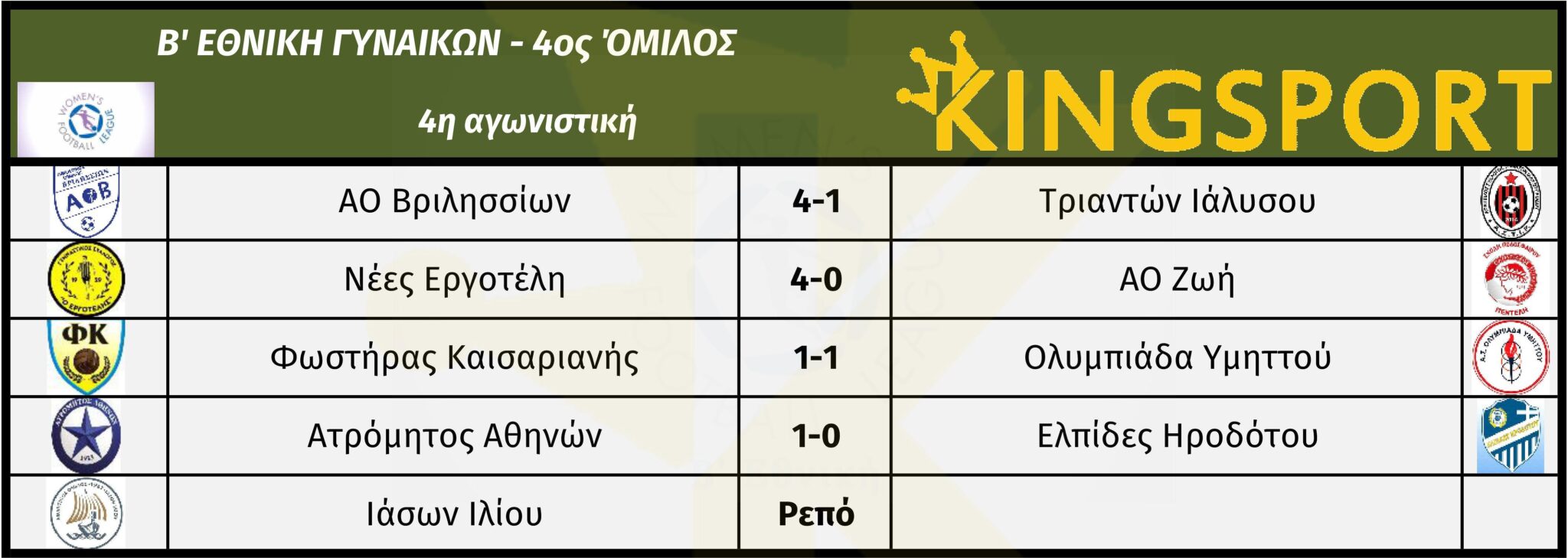 Τα αποτελέσματα της 4ης αγωνιστικής της Β’ Εθνικής Γυναικών 2025-26.