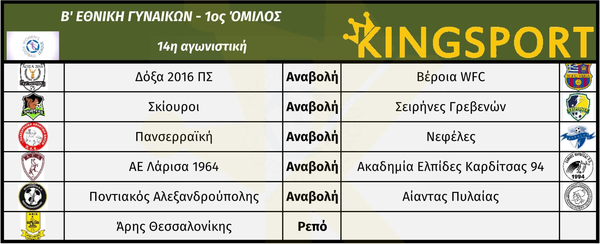 1ος όμιλος: Δόξα 2016 ΠΣ – Βέροια WFC (14η αγωνιστική), Σκίουροι – Σειρήνες Γρεβενών (14η αγωνιστική), Πανσερραϊκή – Νεφέλες (14η αγωνιστική), ΑΕ Λάρισα 1964 – Ακαδημία Ελπίδες Καρδίτσας 94 (14η αγωνιστική), Ποντιακός Αλεξανδρούπολης – Αίαντας Πυλαίας (14η αγωνιστική)