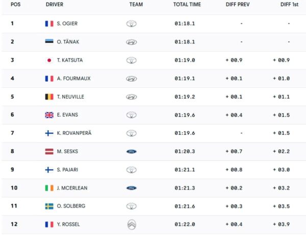 Την πρώτη τριάδα της γενικής συμπλήρωσε ο Τακαμότο Κατσούτα με 1:19.0, ενώ ο Ιορδάνης Σερδερίδης με το εργοστασιακό Ford Puma Rally 1 σημείωσε τον ταχύτερο χρόνο από ελληνικής πλευράς, καθώς ολοκλήρωσε την προσπάθειά του σε 1:27.5.