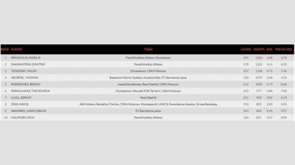 Συγκεκριμένα ο γκαρντ του Παναθηναϊκού ΟΠΑΠ βρίσκεται στη 10η θέση με 831 ασιστ ,ενώ ο εμβληματικός ηγέτης της Μπαρτσελόνα είναι στην 9η θέση με 834.