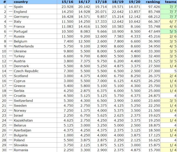 Αυτή τη στιγμή παραμένει 17η, ωστόσο πλέον έχει αφήσει οριστικά πίσω της Σερβία και Κροατία, που έμειναν χωρίς εκπρόσωπο στην Ευρώπη, ενώ κυνηγά την 16η Κύπρο και την 15η Σκωτία.